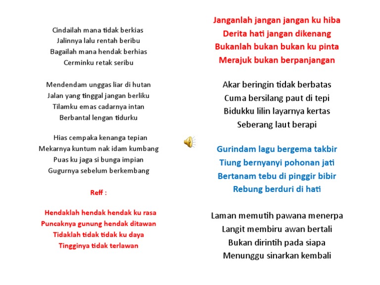 Lirik Lagu Pilihan Editor Hari Ini. Pada 2000 album ini mendapat penghargaan 4X Platinum dari Persatuan Industri Rakaman Malaysia karena berhasil terjual sebanyak 200 kopi. Lirik lagu cindai dan terjemahan bahasa indonesia - lirik lagu cindai dan terjemahannya - lirik lagu cindai dan artinya - lirik lagu cindai siti nurhaliza dan terjemahannya - ada di Bawah ini.