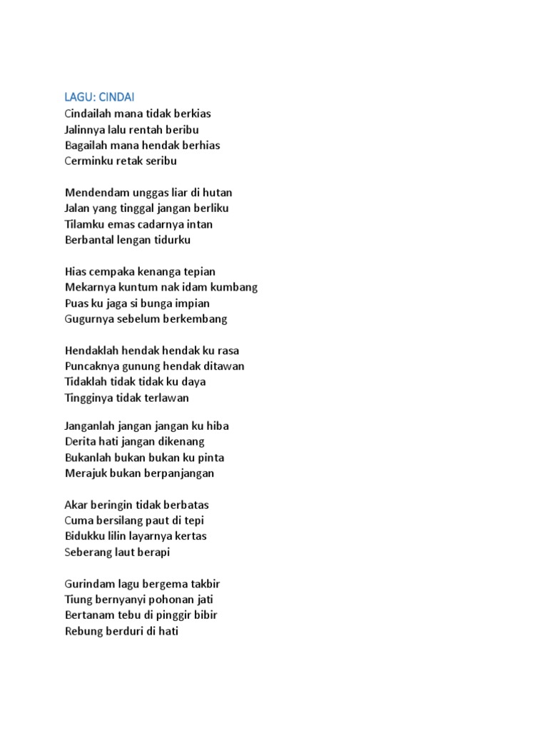 Makna Lagu Cindai Docx Lirik Lagu Ini Disusun Sebagai Pantun Kiasan Yang Mendayu Dayu Pantun Ialah Puisi Melayu Lama Asli Dari Indonesia Yang Terdiri Course Hero